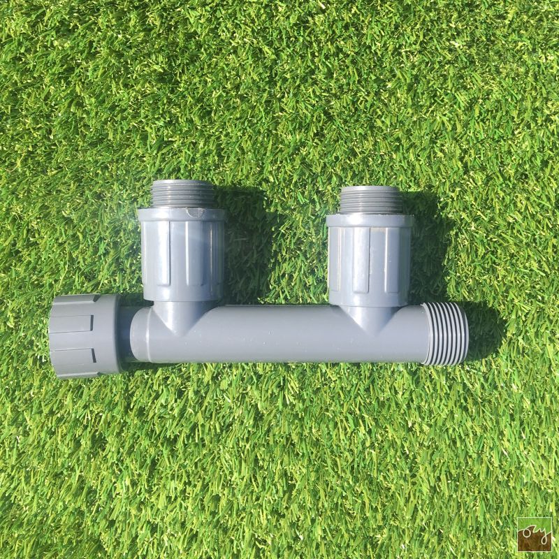 Holendrový 2T-kus je tvarovka s 1" vnějším závitem nacházející uplatnění ve většině zavlažovacích systémech, konkrétně ve ventilových šachtách. Základ t-kusu je tvořen dvěma vývody s unikátní konstrukcí přetáčivých matic, která zajišťuje snadnou montáž a demontáž el. ventilů bez dodatečného použití těsnící pásky či další tvarovky. Závit je vyroben z vysoce-odolného kvalitního plastu a má 100% těsnění s nulovou propustností, i při vysokém tlaku.