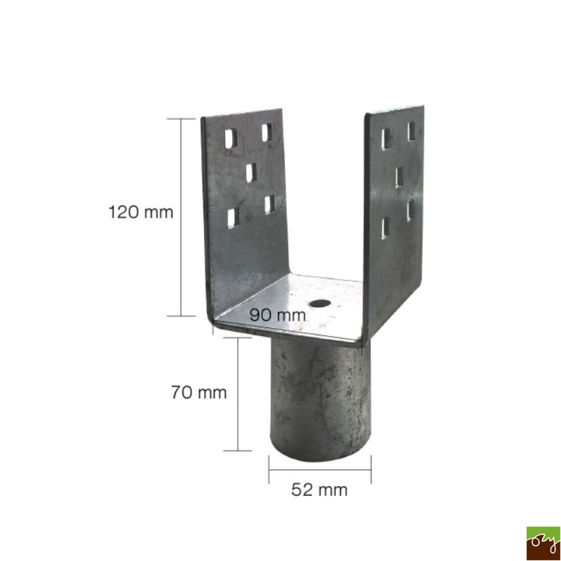 Nástavec "U" na zemní šroub o rozměrech 90x90x120x52mm je určen k přichycení hranolu k zemnímu šroubu o průměru 60 a 68 mm do země.