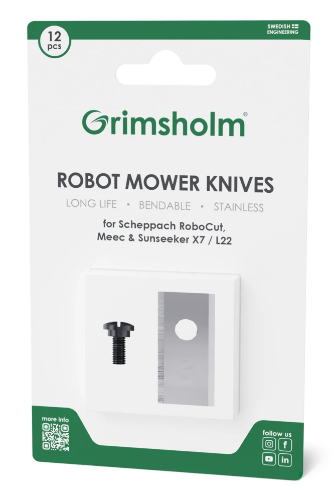 Sada 12ks nožů pro robotické sekačky Scheppach, Sunseeker a Wiper POP je vyrobena z nerezové oceli a optimalizována pro ideální rovnováhu mezi pevností, ostrostí a odolností vůči opotřebení, čímž zajišťuje prvotřídní výsledek sečení.